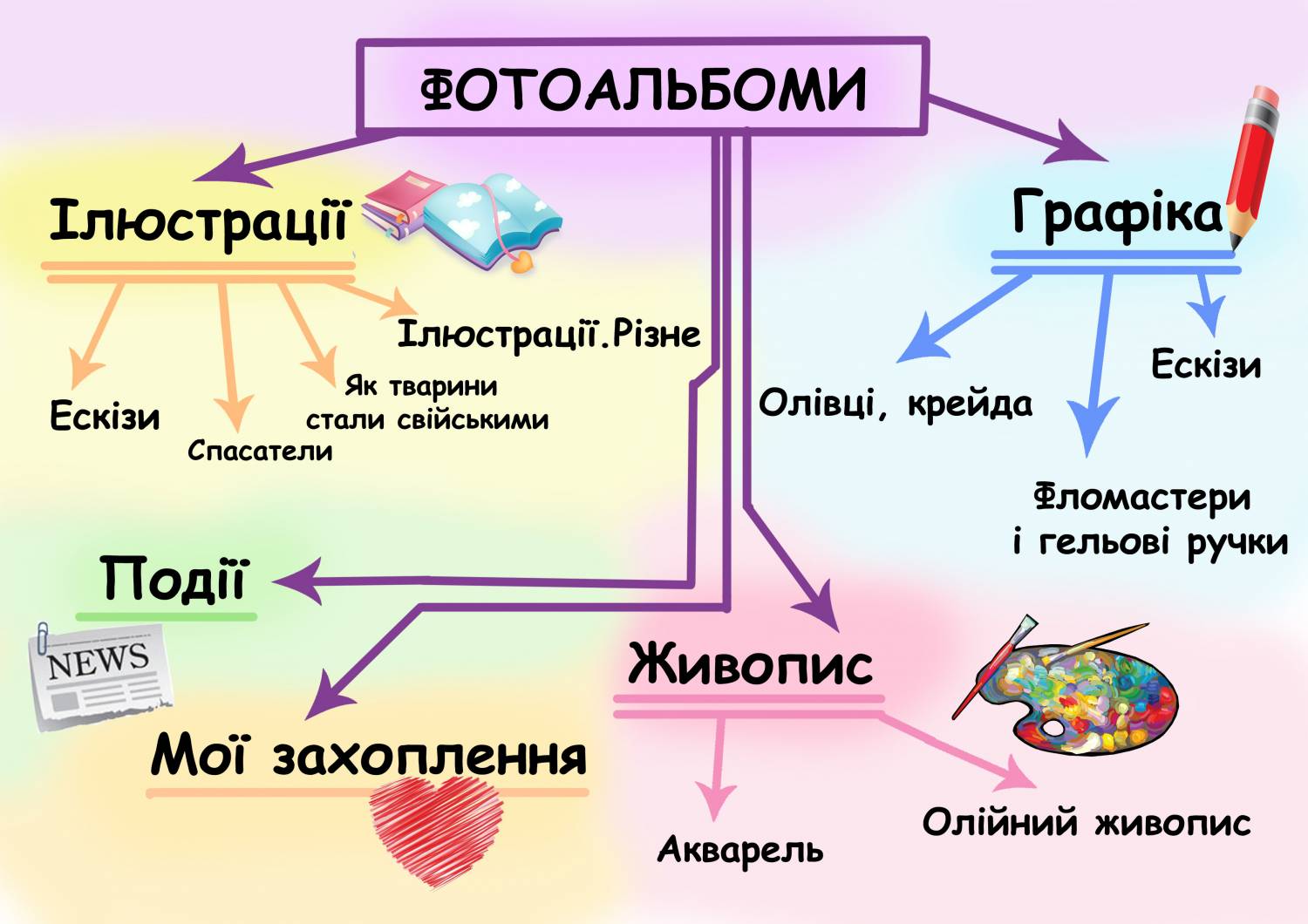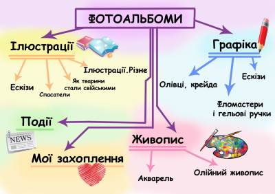 такі підрозділи: 1. Ілюстрації 2. Графіка 3. Живопис 4. Події 5. Мої захоплення.